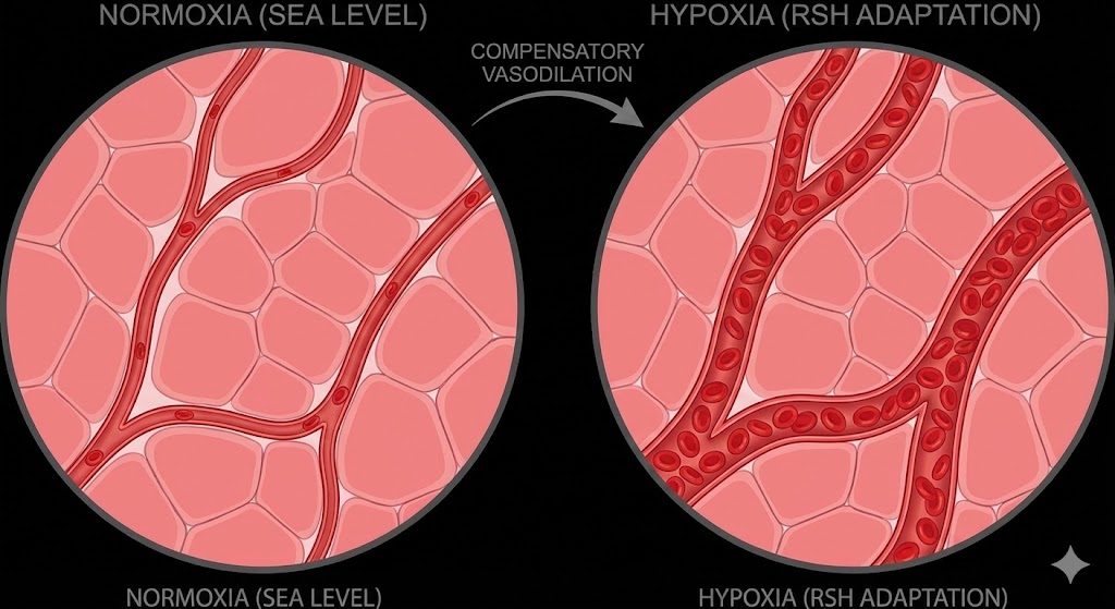 En hipoxia, cambiamos las reglas del juego: Al esprintar sin oxígeno suficiente, generas una crisis fisiológica. El cerebro detecta una hipoxemia severa en el tejido activo y activa un mecanismo de defensa: la liberación masiva de Óxido Nítrico (NO).